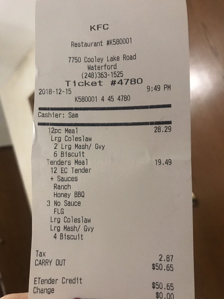 “ I think the food isn't bad when in a hurry. Like the mash potatoes and gravy and coleslaw the only thing is I ordered two legs paid for the extra leg but only got one and a thigh but that's ok I'll check better next time ”